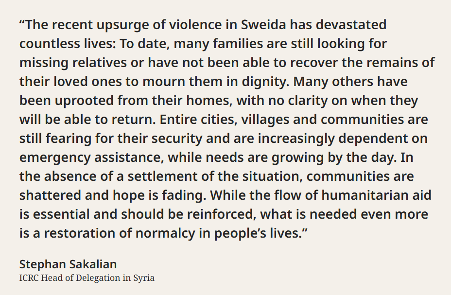 Since July 28, ICRC teams have been on the ground, in partnership with the SARC, listening to local institutions and families, delivering life-saving assistance, and working to restore a sense of dignity and safety amid the ongoing turmoil.