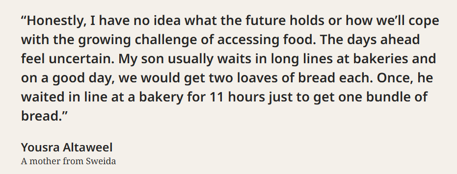 The escalation of violence also caused shortages of food in Sweida and for displaced families in Dara’a. While humanitarian assistance has started to flow, the situation remains dire and will require more sustainable solutions.